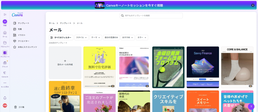 Canvaは、もともとグラフィックデザインツールとして認知されていますが、メールテンプレートについても豊富なバリエーションを備えています。ドラッグ&ドロップで画像や図形、テキストを配置していくUIは初心者にも扱いやすく、デザイン未経験者でも直感的にレイアウトを組みやすい点が特徴です。