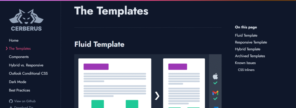 Cerberusは、シンプルで軽量なメールテンプレートを配布しているオープンソースプロジェクトです。「多機能さ」よりも「確実に動く・扱いやすいコード」を重視している点が特徴で、HTMLメールの基本形を理解したい場合の学習素材としても優れています。