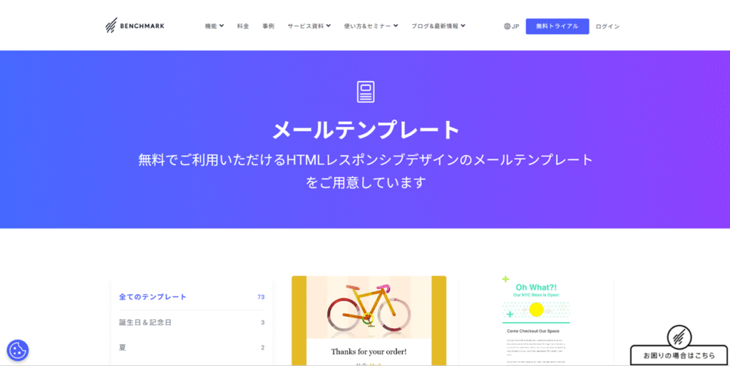Benchmarkは、シンプルで読みやすいメルマガテンプレートを豊富に取り揃えています。日本語フォントに最適化されたデザインが多く、日本企業にとって使いやすいサービスといえます。また、テンプレートカスタマイズの自由度が高く、企業の個性を反映したオリジナルデザインの作成も可能です。