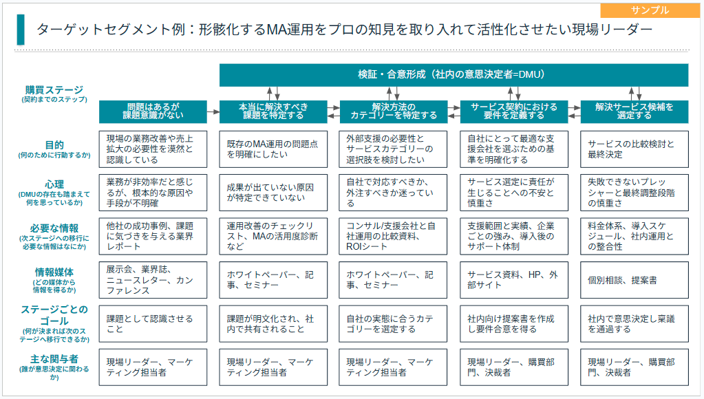 MA運用では、最も獲得効率の高いセグメントから優先的にマップ化するのが現実的です。たとえば「形骸化するMA運用をプロの知見を取り入れて活性化させたい現場リーダー」といったように、条件を具体的に絞り込みます。