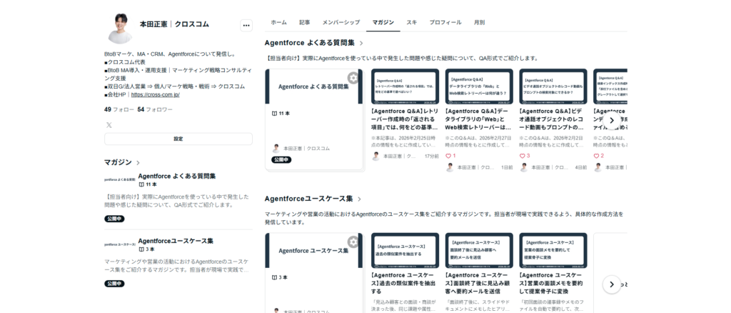 2026年2月10日に代表本田の個人noteにて、SalesforceのAIエージェントプラットフォーム「Agentforce」活用に役立つマガジン連載を開始しました。