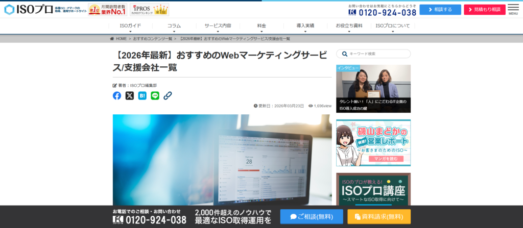 今回クロスコムが紹介されたのは、NSSスマートコンサルティング株式会社様が運営する「ISOプロ」内の、Webマーケティング支援会社をまとめた比較・紹介ページです。事業成長や販路拡大に向けてWebマーケティングの重要性を解説しながら、各支援会社の特徴を紹介する内容となっています。